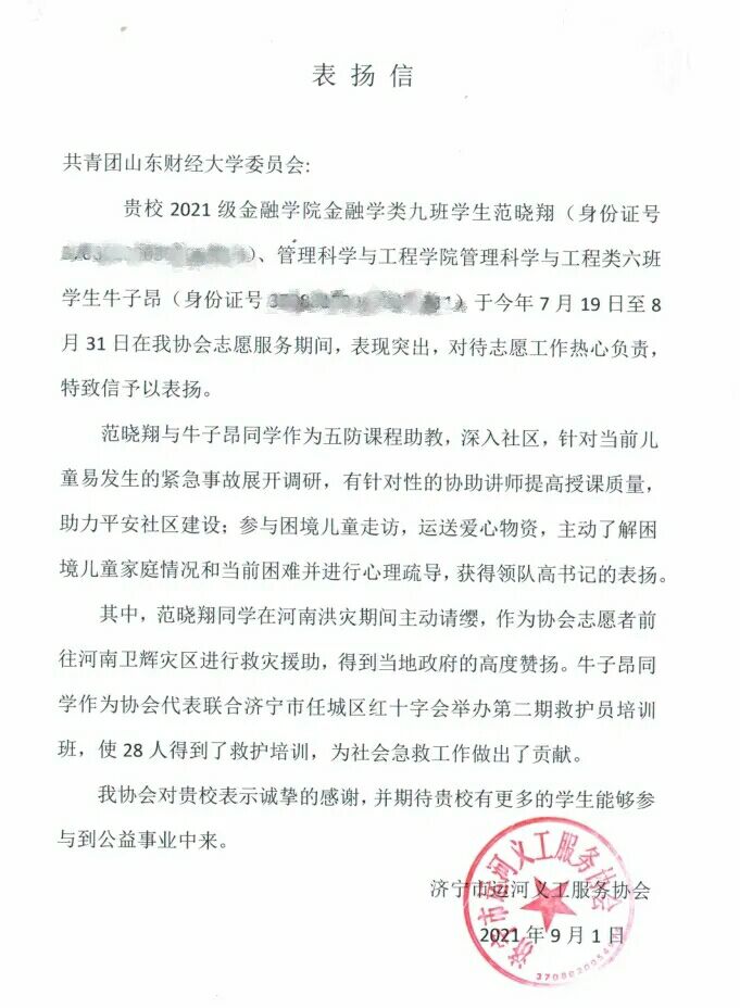 近日,beat365官方网站收到来自济宁市运河义工服务协会的表扬信,信中表扬了beat365官方网站2021级管理科学与工程类牛子昂同学在抗洪志愿服务期间的突出表现。牛子昂同学参与救护员培训班、“五防”知识宣讲等共计336小时的志愿服务工作,期间他还多次进行针对性调研、运送爱心物资、主动了解困境儿童家庭情况并进行疏导。协会对beat365官方网站的人才培养工作表示了肯定以及感谢。