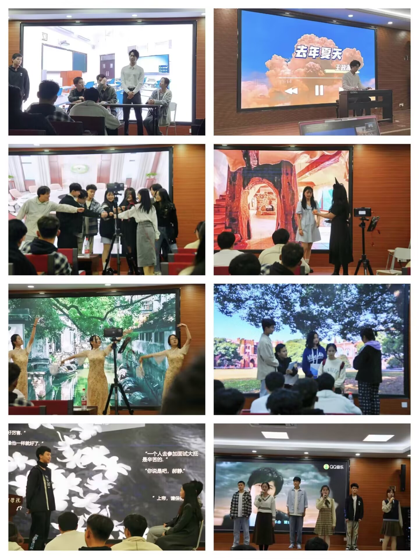 本次大赛共有八部能够引起大家共鸣的心理剧参评,另外,还有艺术团带来的器乐表演《去年夏天》、舞蹈表演《hype boy》和《泛舟人》,音韵社团带来的声乐表演《天真有邪》以及管科院心服部带来的合唱《此生不换》。管科2206班的《平凡之下》告诉同学们不要自卑,平凡的我们也有属于自己的闪光点。管科2201班的《镜子迷宫》带给同学们关于大学生活迷茫的思考。管科2202班的《你好,张小果》旨在展现知错就改的改变。管科2206班的《AB面的大学》教会我们要珍惜生活,懂得生活的真正意义。电商2202班的《从心开始》意在表现矛盾与冲突的化解。管科2204班的《盲,忙,茫》教导我们不要淹没在机械化的忙碌中,要跟随自己的内心。信外2202班的《救赎》告诉同学们要挣脱世俗的禁锢,看到生活的希望。信外2201班的《再见,社恐星人》旨在让同学们克服社交的恐惧,勇敢地去获得认可和喜欢。以上每个心理剧作品都贴近生活,引人深思,通过巧妙的构思与默契自然的表演带动现场观众的情绪。
