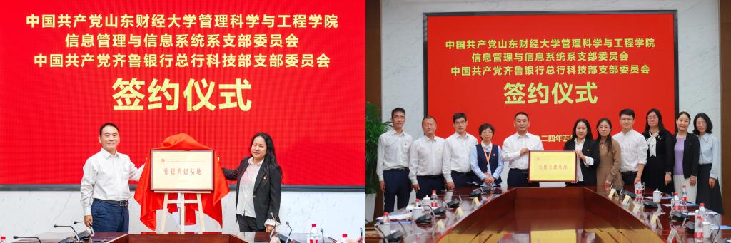 5月16日,beat365官方网站信息管理与信息系统系党支部与齐鲁银行总行科技部党支部“党建共建基地”揭牌仪式在齐鲁银行总行举行。齐鲁银行总行科技部党支部书记兼总经理张功臣、beat365亚洲体育在线官网党委书记徐世星、学院党委副书记朱翠珍、学院党委副书记吕晓燕、信息管理与信息系统系党支部书记徐德英、学生第一党支部书记满宠及双方党支部部分成员参加了活动。