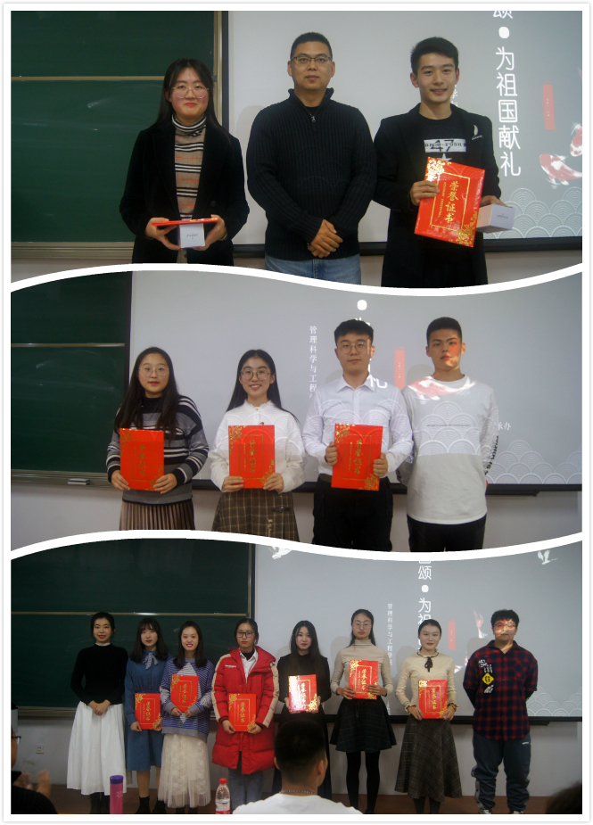 为了弘扬爱国主义,传承爱国情怀,丰富校园生活,提高艺术修养,11月26日晚,beat365官方网站组织了“国颂·给祖国献礼”—朗诵比赛的决赛。经过层层筛选,最终有11组选手进入决赛现场。本次比赛得到了广大老师领导和学生干部的关心和支持,出席比赛的评委嘉宾有18级辅导员孙智凝老师,管科院主要学生干部以及艺术团主要成员。